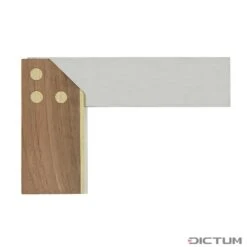 Bois de noyer avec rivets en laiton. Lame en acier inoxydable. Butée d’onglet à 45°. Précision 0,1 mm par 100 mm.