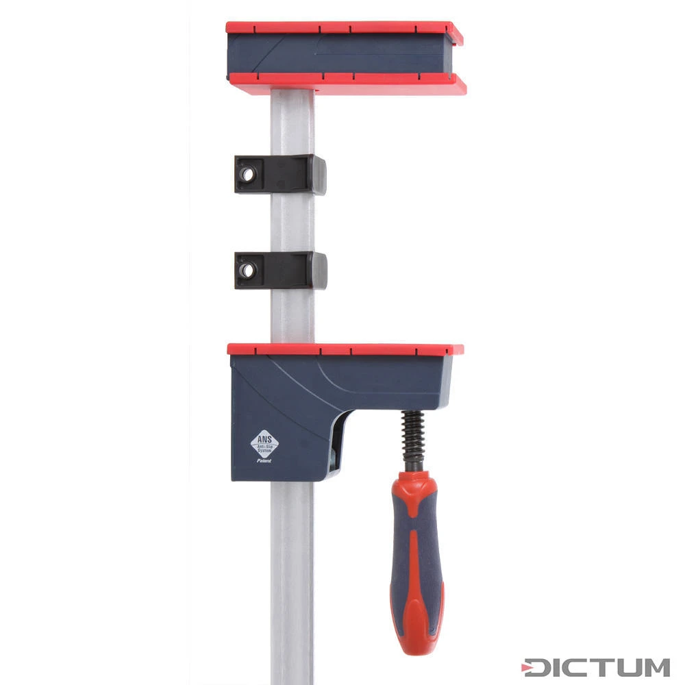 Serre joints avec guidage exactement parallèle et grandes surfaces de tension pour le collage de corps de meubles et de cadres de tous types. Les bouchons de protection en plastique sont anti-adhérents et ne laissent aucune trace de pression, même sur les surfaces délicates. La joue mobile se déplace sur un rail profilé creux thermolaqué et s’enclenche par un système antidérapant, précisément dans la position désirée. Grâce à la largeur du dos et au clip de support au bout du rail, le serre-joints peut également être posé à plat sur l’établi. Les supports livrés avec lui évitent tout contact entre le rail et la pièce à travailler, et par conséquent d’éventuels dommages. Poignée en plastique à deux composants pour un travail ergonomique. Force de serrage jusqu’à 6900 N.